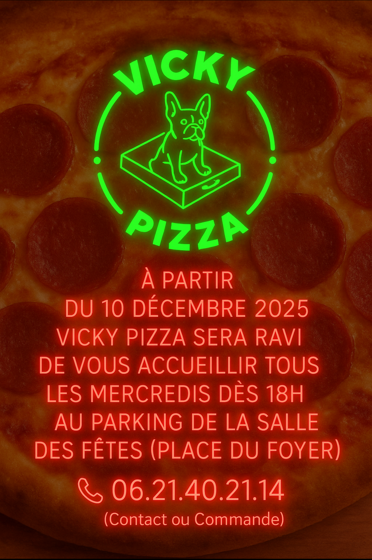 Vicky pizza sera présent sur la commune, place du foyer (parking de la salle des fêtes) les mercredis, dès le 10 décembre.
