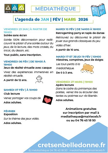 Retrouvez l'agenda des animations proposées par la médiathèque ce 1er trimestre.